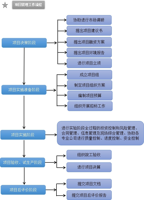 項目管理服務內(nèi)容:為業(yè)主提供貫穿項目前期策劃階段、勘察設計階段、建設準備階段、施工階段、驗收交付階段、保修期管理等各階段的綜合性全過程項目管理及工程咨詢服務。